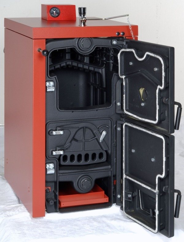 Устройството на класически котел на твърдо гориво не е трудно: дърва за огрев изгарят в камината, пламъкът загрява резервоара за топлообменник, топлата вода отделя топлина на батериите. Основният му проблем вече беше споменат: на всеки няколко часа трябва да зареждате дърва за огрев или въглища и да премахвате пепелта.