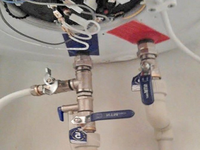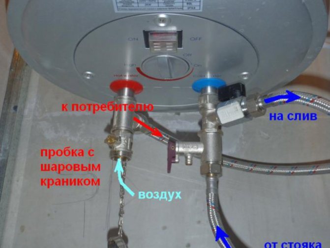 Входът със студена вода е маркиран със син маркер, с топла вода - червен. Свързвайки студена вода, навиваме теглич, намазан с унилак, върху фитинга от бойлера, след което се завинтва тройник. В случай на аварийно оттичане на вода към желания тройник отстрани е прикрепен кран. В долната част на тройника също е вграден предпазен клапан, като предпазен клапан срещу възможността от прегряване или прекомерно налягане. Инсталирайте го със стрелка нагоре. Спирателният клапан е монтиран в самия край на бойлера. След това инсталираме адаптера с резба и го свързваме към водопровода.