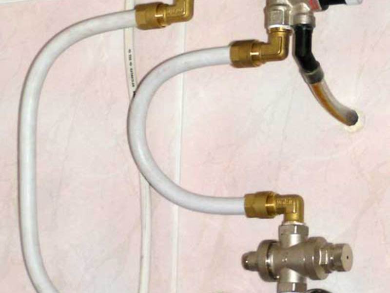 Инсталаторите съветват, че вместо гъвкави маркучи могат да се използват полипропиленови тръби, но това ще струва малко повече и ще отнеме повече време. В долната част на котела има две тръби, едната от които има син пластмасов пръстен. Съответно през него се подава студена вода. Втората тръба е маркирана в червено и е предназначена да оставя гореща вода от нея.