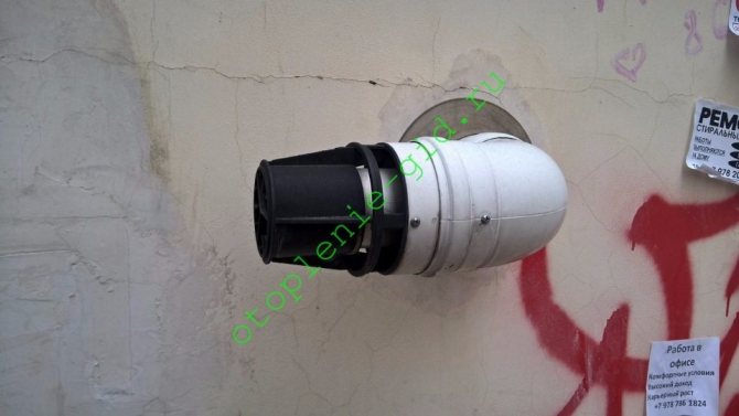 Снимката показва изхода на коаксиалния въздуховод на турбокомпресора през стената на къщата.