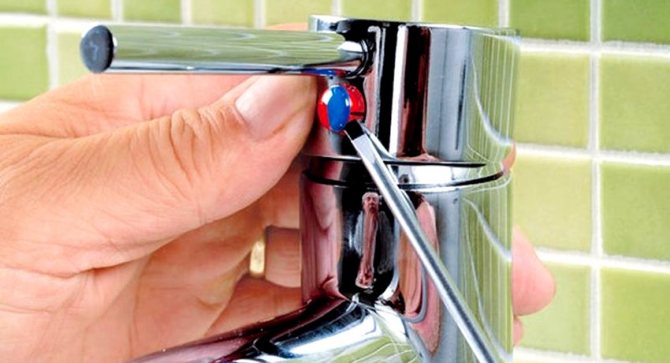 - Изключваме подаването на вода от щранга и повдигаме лоста на миксера до най-високото положение. В долната му част, отпред, намираме пластмасова капачка с червена и синя маркировка - внимателно я извадете с нож или тънка отвертка.Под него ще намерите малък винт, чрез развиване на който лесно можете да свалите лоста на миксера. Не си струва да развиете напълно винта, достатъчно е да го разхлабите малко.