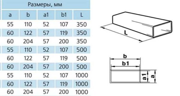 Кръглите въздуховоди се предлагат в три размера: 100 mm, 125 mm и 150 mm. Това е диаметърът на пластмасовите тръби и гофрирани ръкави. Има повече напречни сечения на плоски въздуховоди и те са представени в таблицата.