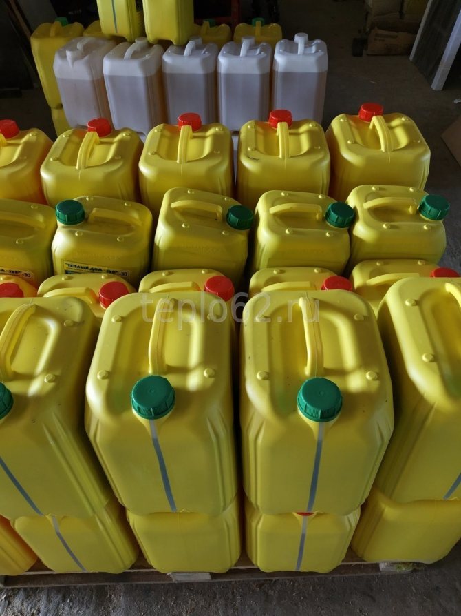 Топлоносител "Teply Dom 65" се доставя в пластмасови съдове от 10, 20 и 50 литра.