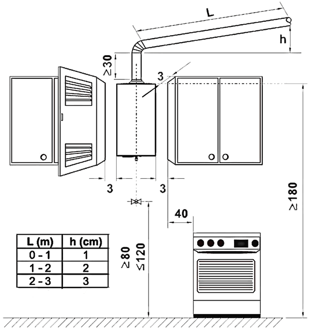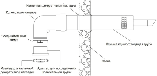 - Изпускателната тръба се монтира на разстояние от тавана или стената от незапалими материали най-малко 5 см, ако те са запалими или трудно запалими, то най-малко 25 см. Разстоянието може да се намали до 10 см, като се вземат предпазни мерки в съответствие със SP 42-101-2003;