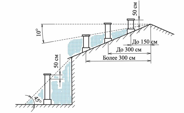 Ако наблизо има по-високи сгради или дървета, тогава е необходимо допълнително да се провери височината на зоната за подкрепа на вятъра и, ако е необходимо, да се увеличи височината на комина. Във всеки случай котата над съседната част на покрива трябва да бъде най-малко 50 cm, а при комбиниран (плосък) покрив - най-малко 200 cm.