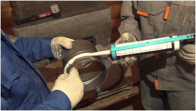 Когато сглобявате, осигурете максимална плътност на връзките. Влизането на един елемент в друг трябва да бъде най-малко половината от диаметъра. За по-добро запечатване се използва топлоустойчив уплътнител. Фугите са закрепени със скоби и разположени извън таваните в свободен достъп.