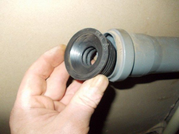 - В канализационната тръба вмъкваме гумена втулка, чийто вътрешен диаметър трябва да е по-малък от външния диаметър на изхода на сифона. Това ще предотврати проникването на миризми от канализацията в стаята.