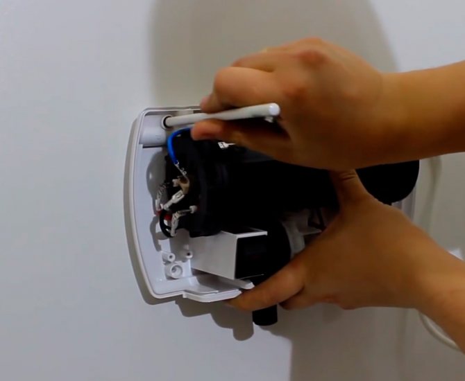Инсталацията започва с определяне на местоположението. Вземаме ниво, молив и маркираме мястото на бъдещата инсталация. Премахваме горния капак от бойлера и го прилагаме към стената, изчертаваме хоризонталата с нивото и маркираме бъдещите дупки. С помощта на бормашина пробиваме отвори за дюбели (или тапи - както искате). Инсталираме дюбелите и закрепваме устройството към стената с винтове.