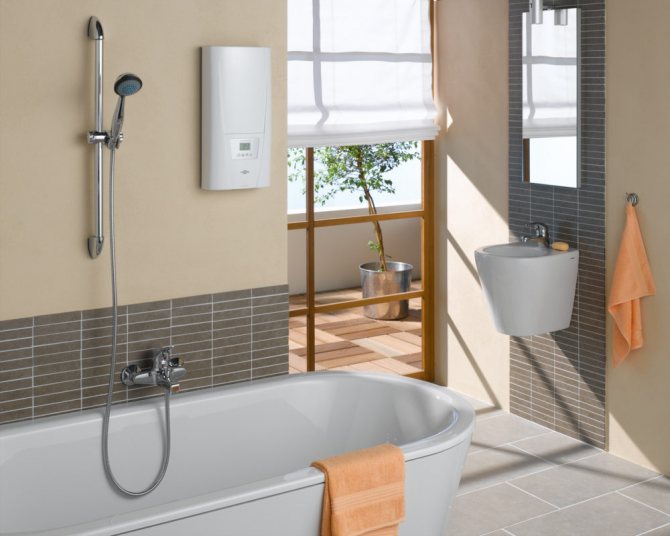 - Компактни размери. Нагревателят на потока не заема много място. В същото време се продават модели нагреватели, в комплект със смесител и душ глава, което позволява допълнителни икономии.
