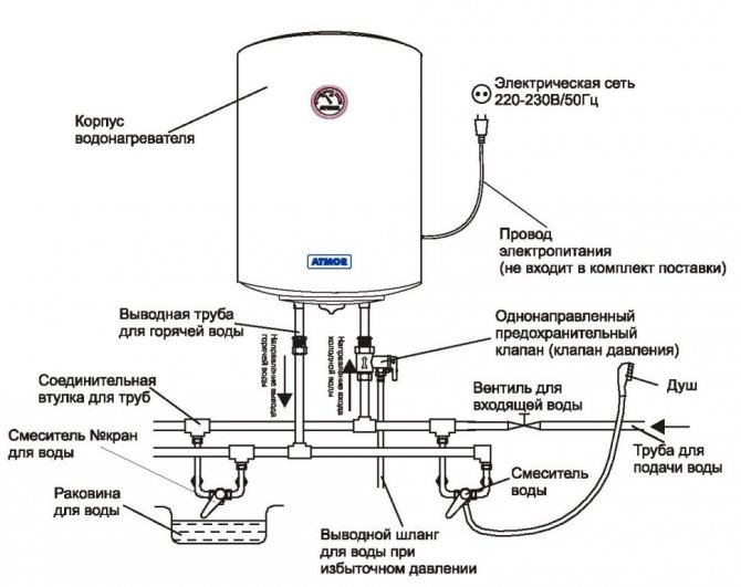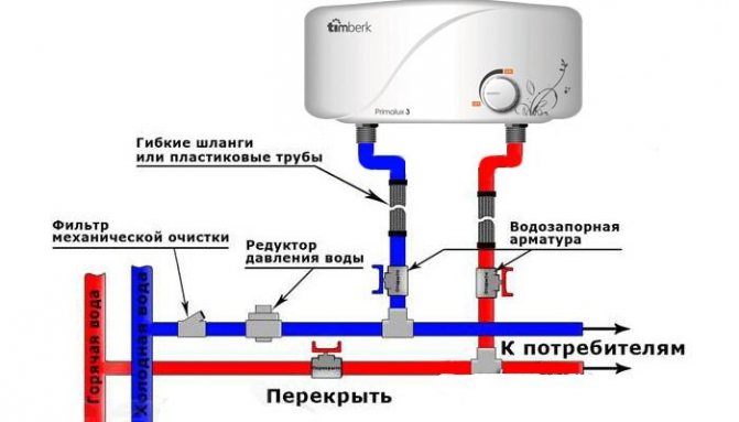 Три възможности за използване на електрически бойлер: 1. Кран за бойлер - инсталиран директно върху мивка или мивка. 2. Маркуч от душовата глава е свързан към входа на устройството, а маркуч с душ глава е свързан към изхода. 3. Студената вода е свързана към входа на устройството от щранга през мек маркуч, към изхода, като се използва специален тройник, кран за мивка и душ кабина.