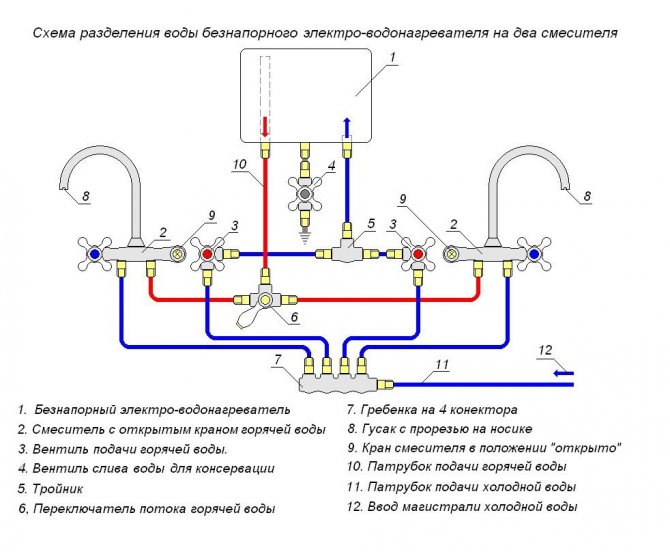 Ако в къщата влезе и тръбопровод с топла вода, тогава в допълнение към свързването на захранването към нагревателя от тръбопровода със студена вода, ще е необходимо да се инсталират две допълнителни спирателни кранове и един тройник.