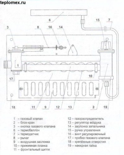- газов клапан с бутон за стартиране - блок клапан с копче за регулиране - разпределител на газ - термо крушка - температурен сензор