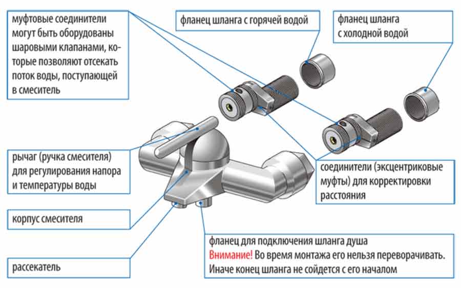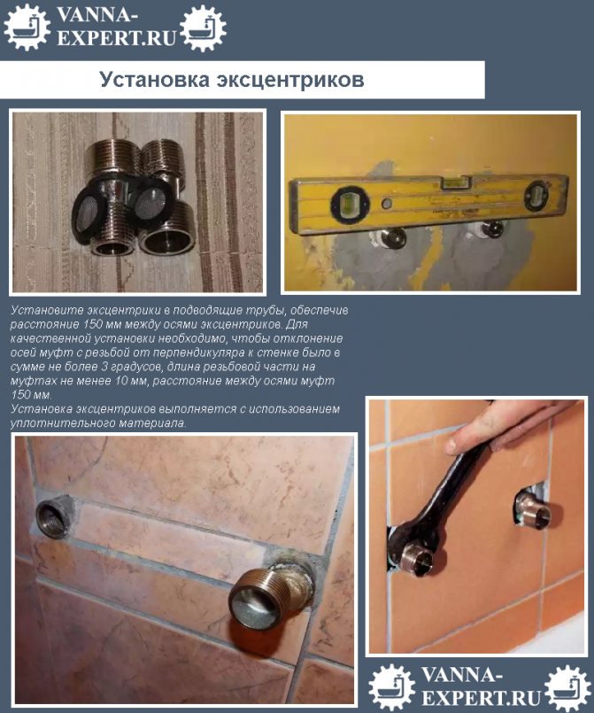 Важно! Разстоянието между входните отвори на корпуса на устройството не може да се регулира, поради което крайните тръби на тръбите трябва да бъдат позиционирани предварително на правилното разстояние, което зависи от модела на смесителя, но най-често равно на 150 mm.
