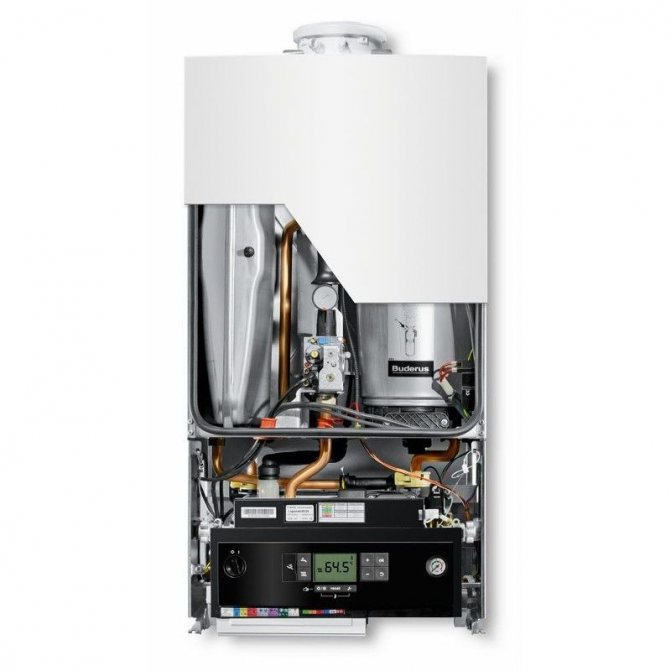 Устройството на модела Buderus Logamax plus GB072-24K: използване на най-добрите материали, сигурност и надеждност на всички възли. Вече е монтиран предпазен предпазен клапан, има устройство за отводняване на кондензат.
