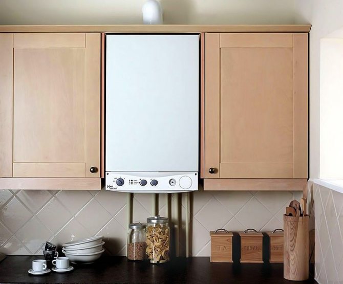 - Малки габаритни размери и не много голямо тегло на продукта (до 50 кг). Съответно, процесът на инсталиране е прост, плюс такива котли заемат малко място, така че инсталирането им в кухнята или в банята е често срещано нещо. Просто още един шкаф за стена се появява в интериора. Освен това модерните газови котли, монтирани на стена, са устройства с представителен външен вид. Така че няма проблеми по отношение на интериорния дизайн.