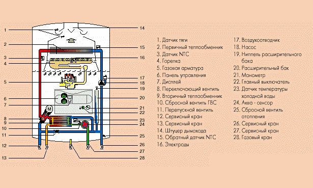 Във фабричната конфигурация на монтиран на стена газов котел по правило има не само отоплителното устройство, но и циркулационна помпа, разширителен резервоар, елементи на контролната система, всички необходими сензори и клапани. Освен това всичко това е скрито в корпуса на самия котел.