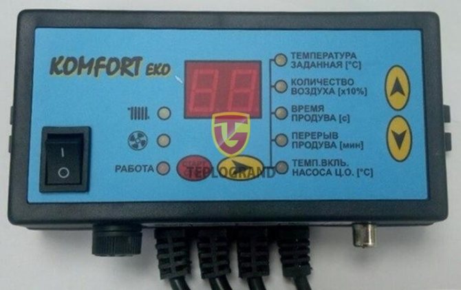 - контролер - електронен блок за управление, който задава скоростта на вентилатора. При максимална скорост на въртене максималният обем въздух се подава в горивната камера и се поддържа най-интензивното горене. Когато са зададени минимални изисквания за температура, минималната скорост на въртене на вентилатора се поддържа или се приема, че е напълно спряна.