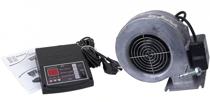 | Икономия на гориво - необходимо е по-малко гориво, за да се постигне една и съща отоплителна мощност, огромна част от излишната топлина не "лети в комина" | Допълнителни разходи - цената на стандартен комплект "контролер + вентилатор" е средно 7-11 хиляди рубли. По желание стаен термостат (около 1-3 хиляди рубли), система за автоматично подаване (от 10 хиляди рубли) |