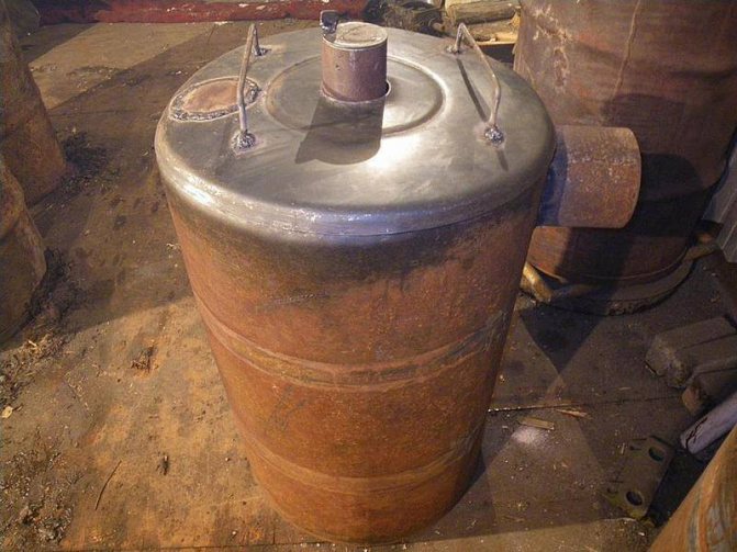 Първо, корпусът на пещта е направен от газов цилиндър. За да направите това, отрежете горната му част по съществуващия заваръчен шев, след което внимателно почистете остатъците от шева отвън. Полученият капак ще трябва да приляга плътно към горивната камера, така че трябва да направите кант от лента от дебел метал около обиколката на цилиндъра, изпъкнала на 15-20 мм над ръба. След това можете да прикрепите към тялото резетата за капака от всякакъв дизайн и да заварите 2 удобни дръжки от метална пръчка към самия капак. В него трябва да се направи дупка по външния диаметър на въздушната тръба.