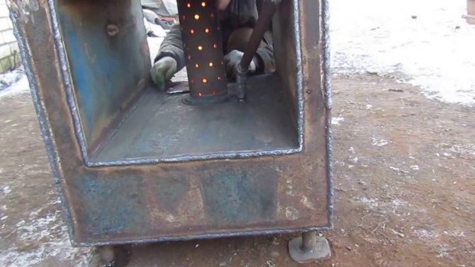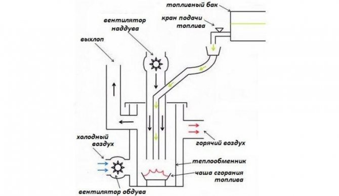 За да може горивната камера да работи нормално, към нейния дизайн се добавя така наречения перфориран въздуховод, през който идва допълнителен въздух поради специален вентилатор на вентилатора. Освен това маслените пари се смесват с въздуха и образуват определена смес, която може напълно да изгори. В резултат охлаждащата течност на отоплителната система ще се затопли докрай и продуктите от горенето ще отидат в комина.