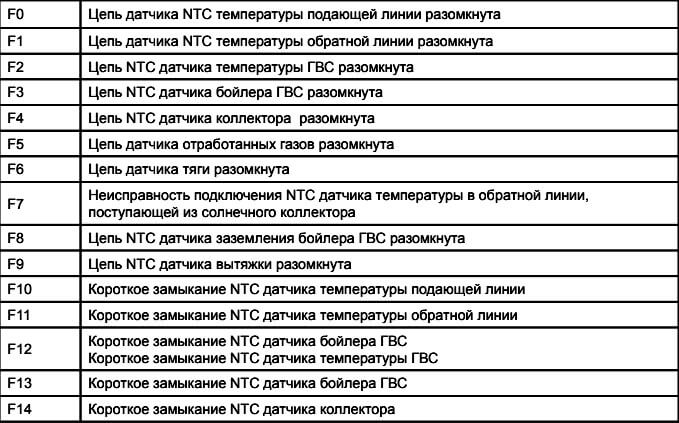 Благодарение на функцията за самодиагностика, съвременните котли сами определят неизправности и информацията под формата на цифрови или буквено-цифрови кодове се показва на електронен дисплей. След като разбрахте какво се крие под този или онзи код, можете от таблицата, публикувана в инструкциите за инсталиране и експлоатация.
