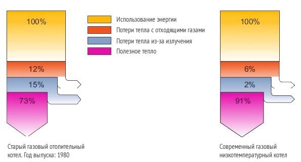 В противен случай ефективността зависи единствено от технологичното съвършенство на модела, насочен към намаляване на горните q2-6 (понижаване на температурата на отработените газове, ефективно изгаряне на гориво, модулиращи горелки, топлоизолация и др.), Както и от качеството на поддръжка и експлоатация на котела. Чистотата на охлаждащата течност, редовното почистване и промиване - всичко това с течение на времето влияе сериозно на ефективността.
