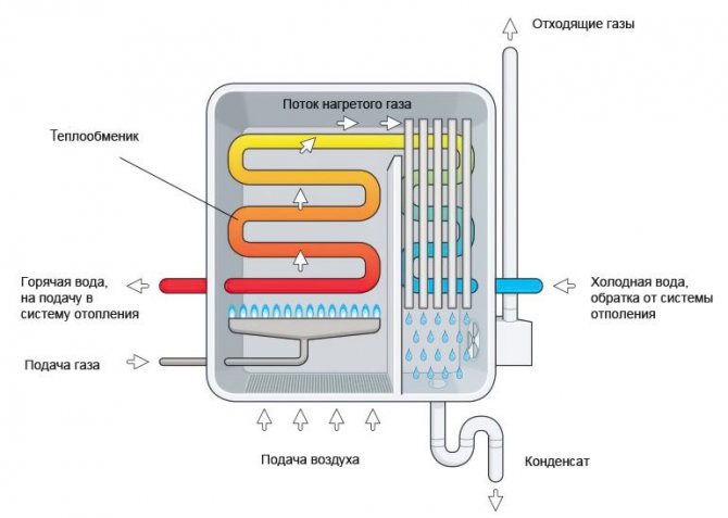 Газовите кондензационни котли допълнително акумулират топлинна енергия на кондензат, образуван от продуктите от изгарянето на газ и отложен върху допълнителен топлообменник. По този начин значителна част от топлината не "лети в комина", а температурата на отработените газове е практически равна на атмосферната.