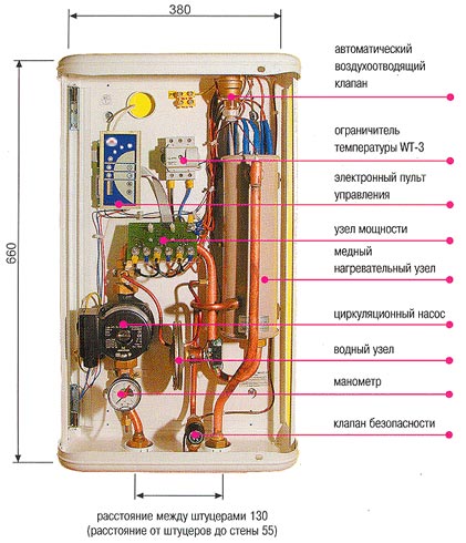 - Термичен превключвател ... Изключва оборудването при прегряване. Свързан с термичния сензор, разположен в горната част на електрическия котел.