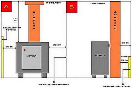 Повърхността на стената, където ще бъде разположен котелът, трябва да бъде направена от незапалими материали. Ако случаят не е такъв, тогава на стената трябва да се постави 3 мм слой топлоустойчиво покритие. Правилата за инсталиране на газов котел предполагат, че устройството е поставено на разстояние най-малко 45 милиметра от стената. Вижте също: "Какви правила за инсталиране на газов котел в частна къща трябва да се спазват."