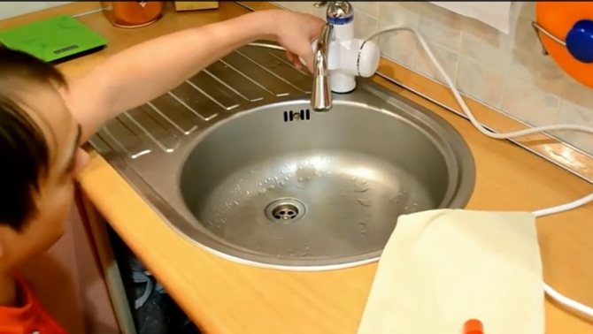 - Изключителна простота на инсталация, която не изисква промяна на системата, - достатъчно е да демонтирате смесителя на мивката и да инсталирате нагревател на кран на негово място, а също така да го свържете към мрежата, за 3 киловата, просто включете щепсела в контакта.
