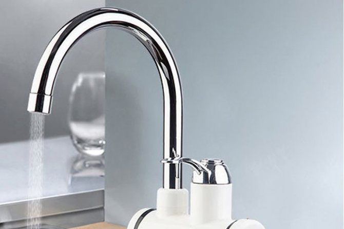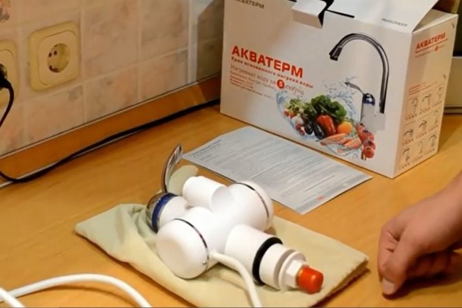 - Отделна дюза за отопление. Устройството се поставя върху чучура на предварително инсталирания кран. Не е необходимо да се извършват сложни монтажни работи. Недостатъците на дюзата са ниска мощност, слабост на натиска. Устройството загрява не повече от 4 литра течност в минута. Компактните размери не позволяват комплектоване на нагреватели със сложни модули за безопасност. Има само термичен сензор, който не позволява изгарянето на нагревателния компонент.