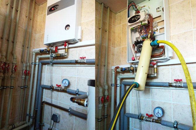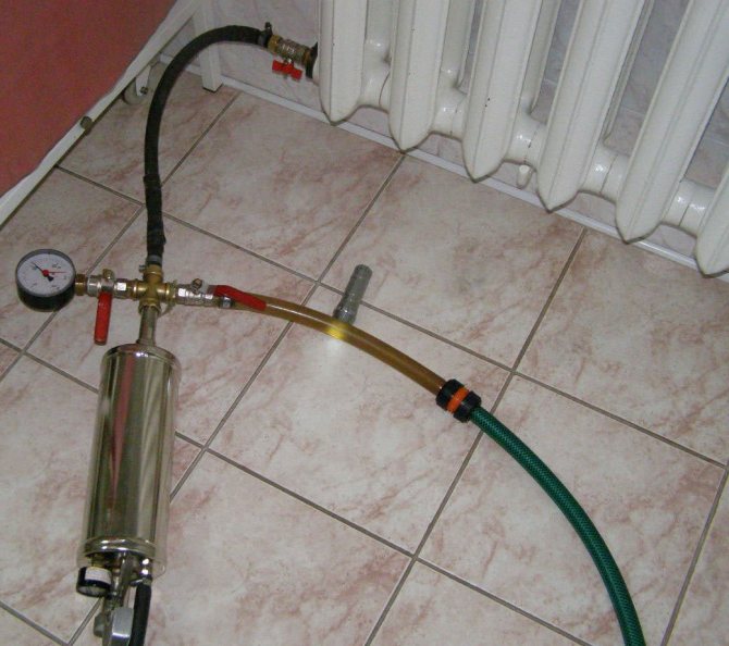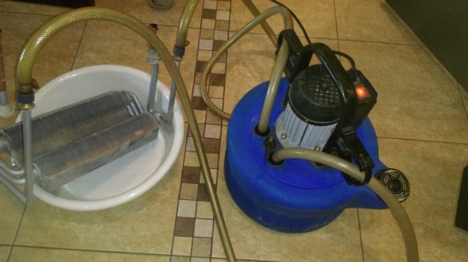 Такава работа се извършва с помощта на помпа за промиване на отоплителната система, изпомпване на химическа течност под налягане.