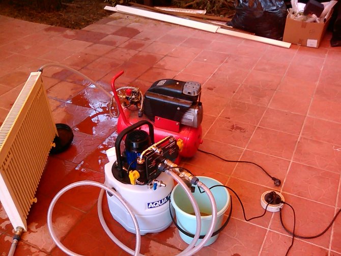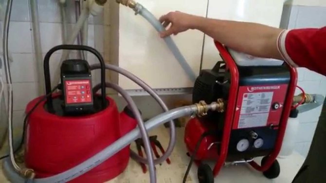 Оборудването за промиване на отоплението, което се управлява по електронен път, осигурява равномерно пулсираща смес от вода и въздух, а сгъстеният въздух се подава от свързания компресор. Такава смес преминава през отоплителна система или битов газов котел за отопление и след това се оттича в канализацията.