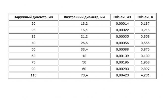 Въз основа на вътрешния диаметър на тръбите, в документацията можете да разберете количеството течност, което те задържат на работен метър: