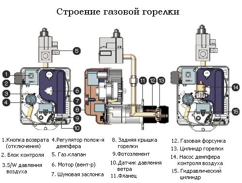 Газовата горелка се състои от няколко блока: дюза, система за запалване, система за автоматизация и детектор на пламък.