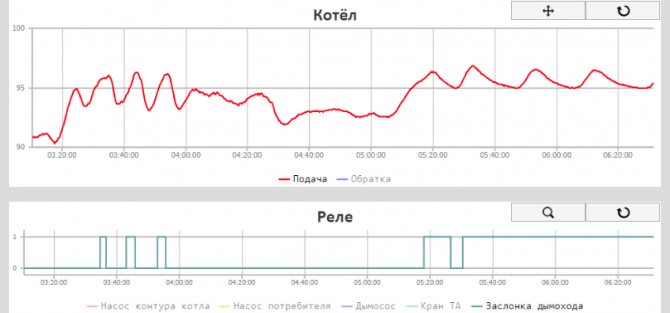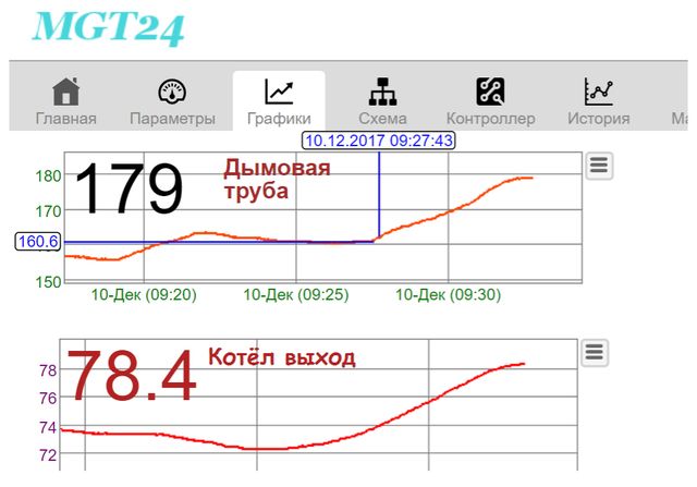 Моят блок за управление на котела е свързан с облачна услуга, това ми позволява да наблюдавам дистанционно състоянието на системата и, ако е необходимо, също и дистанционно, да правя корекции в работата на котела и отоплителната система като цяло. Защо да поискате дистанционно управление на отоплителната система и по-специално дистанционно управление на работата на TTK? Вярвам, че само много смел човек може да си позволи да остави работещ котел само под надзора на контролен блок, който струва малко повече от 100 долара. Получих увереност в необходимостта от дистанционно управление, тъй като натрупах личния си осемгодишен опит в управлението на TTK. Тази услуга предоставя изключително полезна възможност за графично представяне на данни от температурни сензори, разположени в ключови точки на CO, което от своя страна не само дава представа за текущото статично състояние на CO, но и за динамиката на развитието на процесите, протичащи там. Така че, по-специално, данните, получени от раздела "Графики", дават представа за текущото състояние на CO, за коректността на работата на отделните му компоненти в съответствие с програмата, посочена от CU, и за разлика от тях на данните, получени от монитора на CU, дайте представа за динамиката на тези данни, скоростта на промяна и посоката на движение (увеличаване или намаляване), което е особено важно по време на прагови (критични) температури. Независимо дали TTC е бил попълнен със студена вода от TA или не, можем дистанционно, незабавно да проследим „Вход на котела“ на графиката и дали този грим е имал очаквания резултат от предпазване на котела от прегряване, можем да го проследим графиката "Изход на котел". Ако очакваното понижаване на температурата на водата на входа / изхода на котела не е настъпило, тогава по някаква причина клапанът на веригата TA не се отваря и собственикът на котела трябва да предприеме адекватни мерки за защита на TTK. Също така данните, получени от тези графики, ви позволяват бързо да забележите и отстраните грешките на оператора на котела, допуснати при управлението на котела.По-специално, благодарение на графика "Комин", навреме забелязах, че съм забравил да върна в работно положение разпределителната клапа, която насочва продуктите от изгарянето на горивото, заобикаляйки топлообменника на котела в комина (обикновено той се прехвърля към този положение при добавяне на гориво за намаляване на дима в помещението), което от своя страна доведе до превишаване на температурата в комина над 250 ° C.