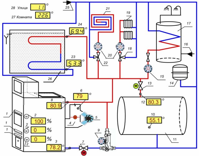 При достигане на праговата температура на изхода на котела над 85 ° C. BU TTK дава команда за отваряне на сферичния кран (№ 13), докато топлата вода се подава не само към отоплителните устройства на къщата (топъл под и радиатори), но и към ТА (№ 12), докато студената вода, излизаща от ТА, отива до входа на ТТК, което от своя страна води до намаляване на температурата на изхода на котела. С други думи, цялата излишна топлина се насочва към акумулатора на топлина.