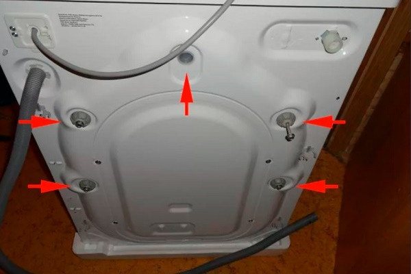 - Болтовете също трябва да бъдат свалени.които са инсталирани отпред на машината за фиксиране на барабана. По-добре е незабавно да поставите пластмасови тапи в отворите от отстранените елементи (те обикновено се доставят с модела).