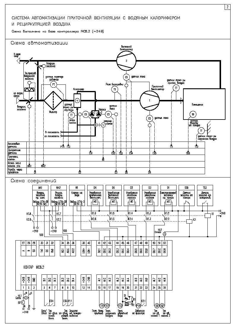 Аналогови и дискретни сигнали от сензори и изпълнителни механизми на захранващата, изпускателната и захранващата и изпускателната вентилация се подават към контролерите, подлагат се на първична обработка и след това чрез цифровия интерфейс RS485 (протокол Modbus) се предават на работната станция на оператора с цел тяхното по-нататъшно обработка, показване и съхранение. Работното място на оператора се използва и за дистанционно управление на изпълнителните механизми на вентилационните системи.