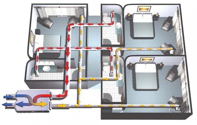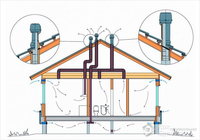 - Осигурете изпускателни канали при проектирането на системата... Те трябва да бъдат оборудвани в онези помещения, в които се натрупва замърсен, горещ, напоен с въздух въздух (тоалетна, баня, перално, баня, кухня).