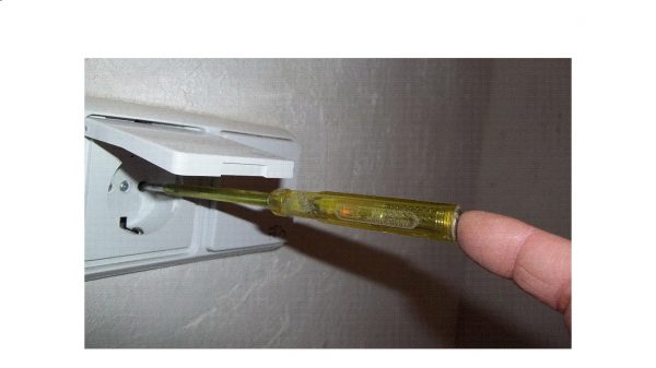 - Можете също да проверите изхода с индикаторна отвертка. Поставете отвертка в първия и след това във втория отвор на гнездото. Където е фазата, светлинният индикатор на отвертката ще светне. Ако докосне нула, отвертката няма да изгори.