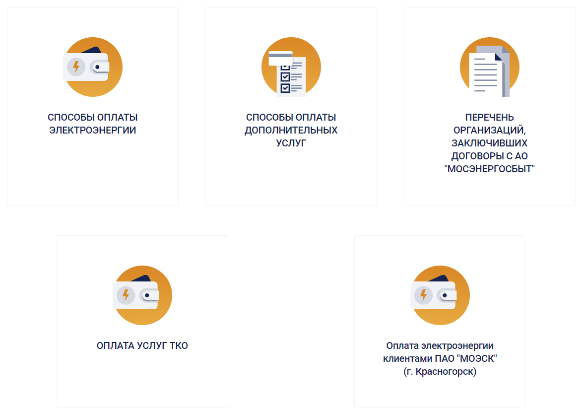До предишния раздел на главната страница на официалния уебсайт на Mosenergosbyt има раздел "Как да платя сметката", в който трябва да отидете на подраздел "Начини на плащане за електричество".