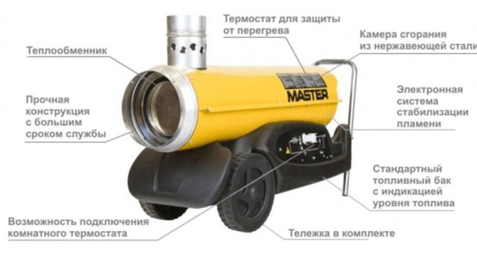 Термичното дизелово оръдие работи на гориво - бензин, дизел, дизелово гориво, керосин и др., Което оскъпява използването му редовно.Някои модели консумират по-малко гориво без значителни загуби в производителността, но освен това струват и повече (например дизеловият топлинен пистолет „Master“). Топлинните пистолети са разделени на два вида, в зависимост от наличието на коминна система. Някои модели може да изискват мрежова връзка, за да работят. това е необходимо за работата на вентилатора и комина (ако последният е наличен). Основните компоненти на дизеловия пистолет: