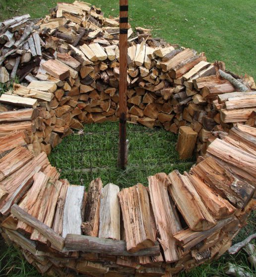 Около стълба (или колчето) направете кръг с еднометрово въже, като по този начин маркирате перфектен кръг и равномерен вътрешен ръб на бъдещата купчина. Подредете дървото така, че да има място в средата.Когато стекът е висок повече от 1 метър, подредете горните редове, за да създадете наклон за оттичане на дъждовна вода. Накрая направете навес от полиетилен или профилиран лист.