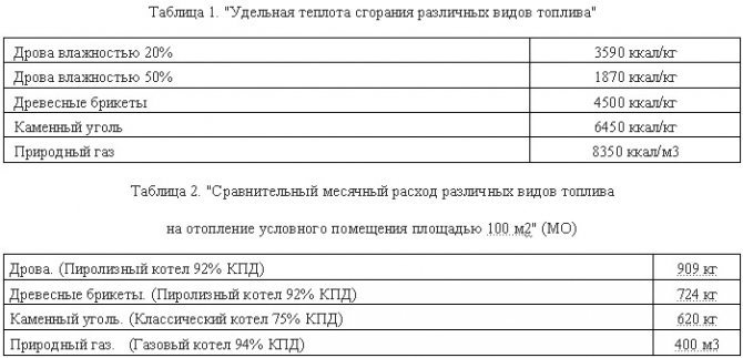 Специфичната нетна калоричност на абсолютно сухата дървесина е 4440 kcal / kg. При естествено сушене за около две години остатъчното съдържание на влага в дървесината е 20%, специфичната топлина на горене е 3400 kcal / kg. Ще приемем ефективността на котел на твърдо гориво като 70%.