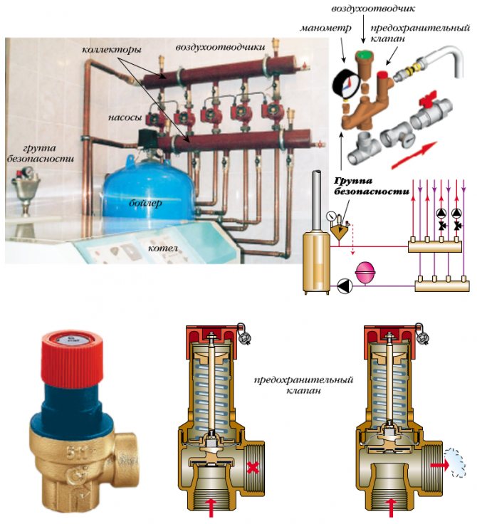 Предпазният клапан се поставя непосредствено зад изхода на котела (достатъчно е да се оттегли 20-30 см). За визуален контрол, наблюдение на състоянието на системата, се изисква манометър.