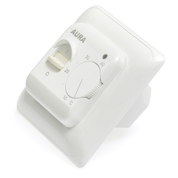 - С биметална плоча и контактна група - в такива регулатори е разположена плоча, която при нагряване до определено ниво се огъва, отваряйки контактите на веригата, които захранват отоплителното оборудване. При охлаждане протича обратният процес: плочата се изправя, затваря контактите и нагревателят се включва. Включването на това устройство се регулира с помощта на въртящ се циферблат с тласкач, който променя разстоянието между плочата и фиксираните контакти, затворени от нея.