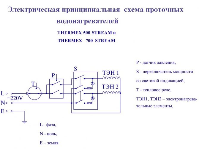 По-горе са схемите на устройства от различни модели проточни бойлери. Както можете да видите, в тези бойлери са предвидени нагревателни елементи, към които електрически ток преминава през реле за контрол на температурата, превключвател за налягане и превключвател. И двете релета във веригата имат защитна функция и изключват мрежата, ако някой от параметрите не е правилен. Превключвателят се използва за регулиране на работната мощност на устройството.