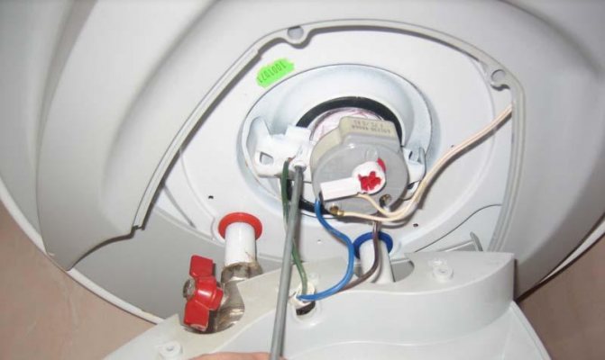 - Отстранете проводниците, като преди това сте ги маркирали с маркер. Проводникът е прикрепен към клемите на сензора с винтове. Трябва да се помни, че преди започване на работа бойлерът трябва да бъде изключен от мрежата.