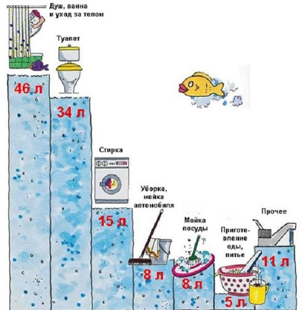 - Ако водата се използва само за храна, пиене и миене на съдове, както и сутрешно и вечерно измиване, тогава дори 30 литра на човек може да са достатъчни.